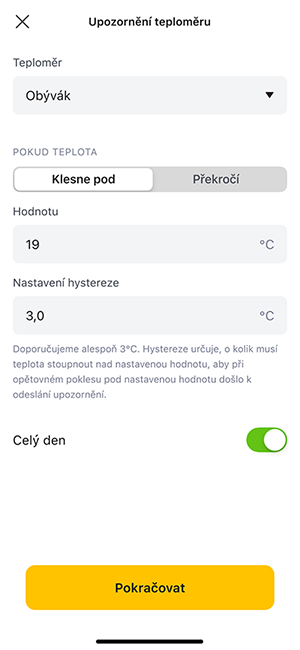 Teplotní hystereze u notifikací určuje, o kolik stupňů se musí skutečná teplota změnit, aby se z aplikace znovu odeslalo upozornění. Dříve byla tato hodnota pevně nastavena na 3 °C.