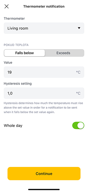 The temperature hysteresis for notifications determines how many degrees the actual temperature must change in order for the app to send another notification. Previously, this value was fixed at 3 °C.